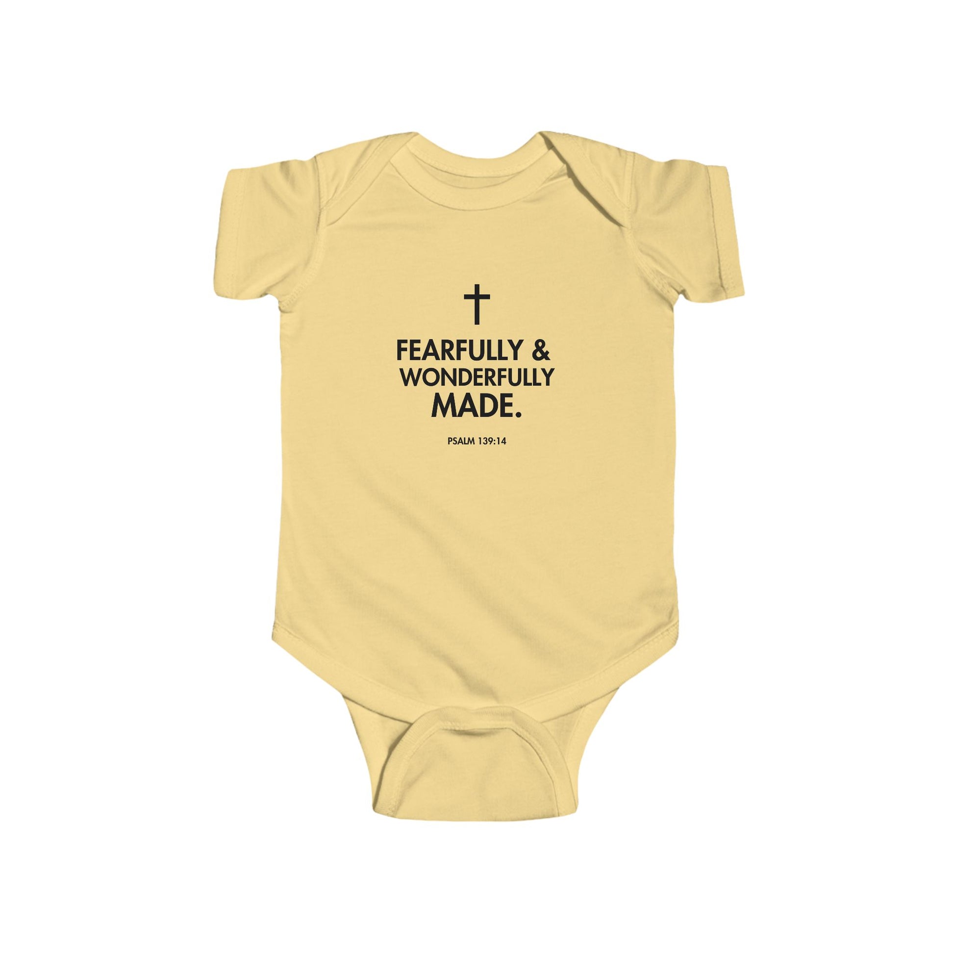 Introducing the perfect blend of comfort and style for your little one – our Infant Fine Jersey Bodysuit. This adorable bodysuit features a heartfelt message, 'Fearfully & Wonderfully Made,' inspired by Psalm 139:14. It exudes a warm, nurturing vibe that embraces the joy of new beginnings and the wonder of life. Crafted from high-quality materials, this bodysuit is perfect for daily wear or special occasions like baby showers, christenings, or family gatherings. Designed for those who cherish family values and religious sentiments, it’s a thoughtful gift for parents, grandparents, and loved ones celebrating the arrival of a new baby. Its gentle, soft fabric ensures maximum comfort for delicate skin, making it an essential addition to your baby's wardrobe during their early years.